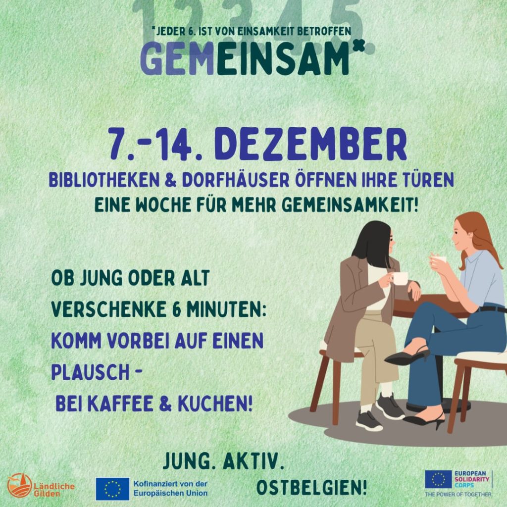 Viele Menschen sind von Einsamkeit betroffen. Diesbezüglich öffnen wir vom 7 – 14 Dezember unsere Türen um gemeinsam mit Ihnen Zeit zu verbringen.